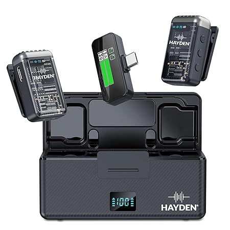 Hayden HY-MIC2 Wireless Lavalier Microphone Type-C | Vlogging Mic for Youtubers Noise Cancellation 360° Audio Pickup 9 Hours Backup 50m Range Clip-On Mic for Video Recording Live Streaming Podcast Brand: Hayden. Recommended Uses For Product Streaming, Video Conference Brand hayden Model Name HAYDEN Connector Type USB Type-C Special Feature Wireless About this item Wireless Vlogging Mic System – Designed for YouTubers, vloggers, and content creators; delivers studio-quality sound for video recording, podcasting, and interviews. 360° Audio Pickup with Noise Cancellation – Captures clear, crisp sound in all directions while reducing ambient noise for professional-grade clarity. 9 Hours Continuous Backup – Built-in 150mAh battery with 600mAh charging case ensures all-day shooting for live streaming, podcasting, and outdoor recording. 50 Meter Stable Transmission – Advanced 2.4G wireless connection provides lag-free, real-time audio up to 50 meters without interference or Bluetooth pairing. Type-C Plug & Play Compatibility – No Bluetooth or apps required; plug directly into Android, iOS (with adapter), laptops, or tablets for instant setup. ›